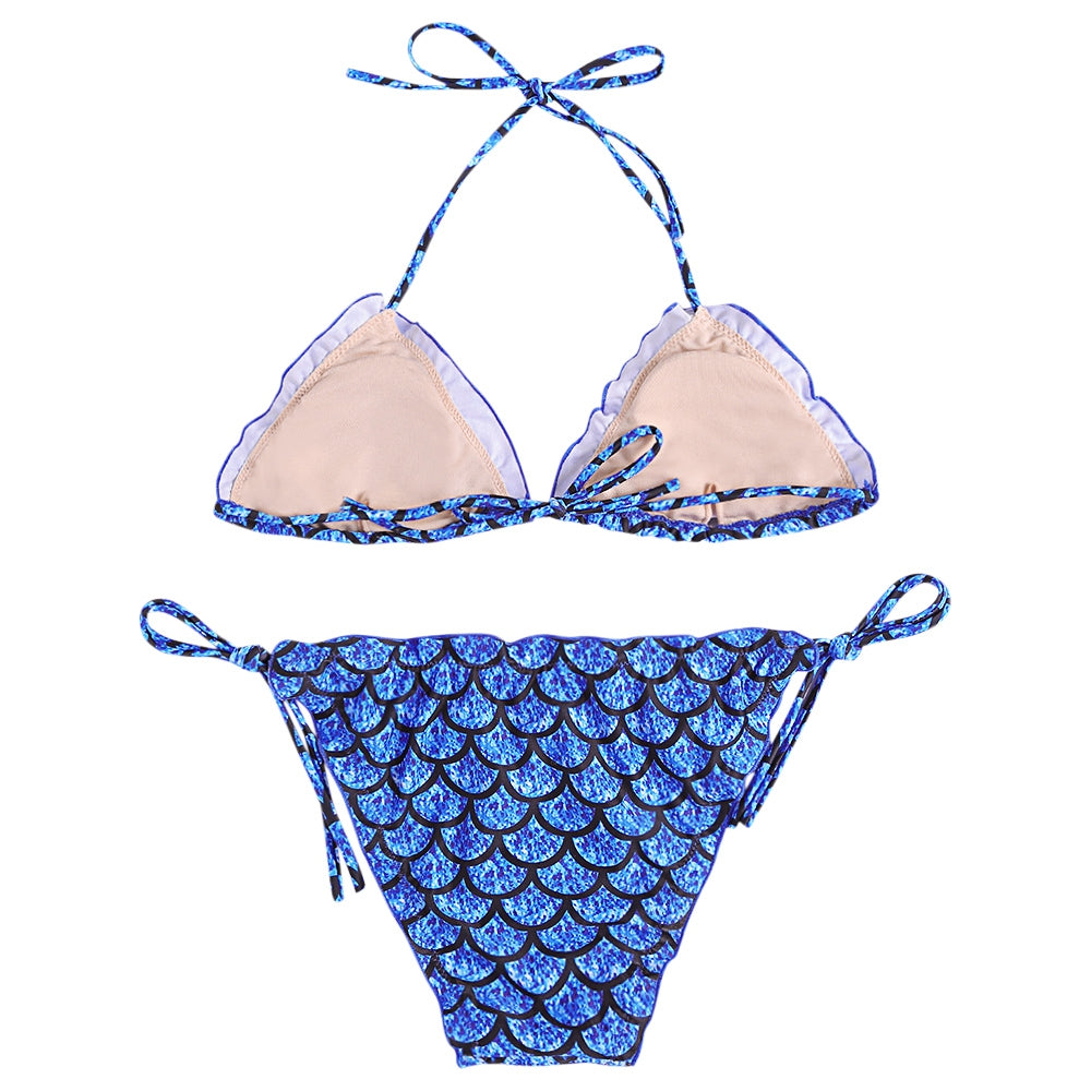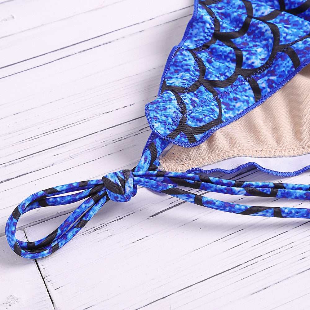 Fish Scales Print Ruffle Strap Side Tied Low Waist Bikini Set for Women