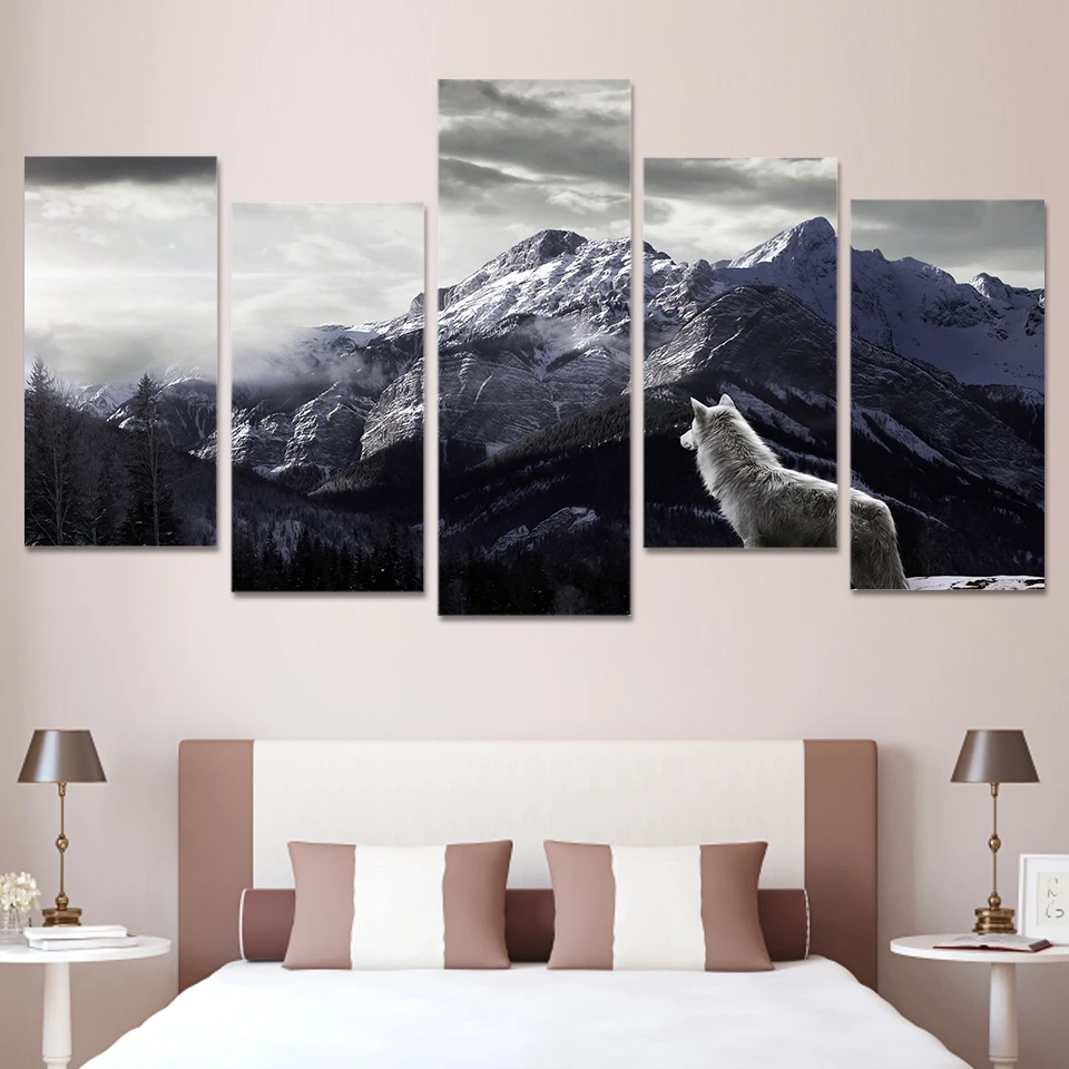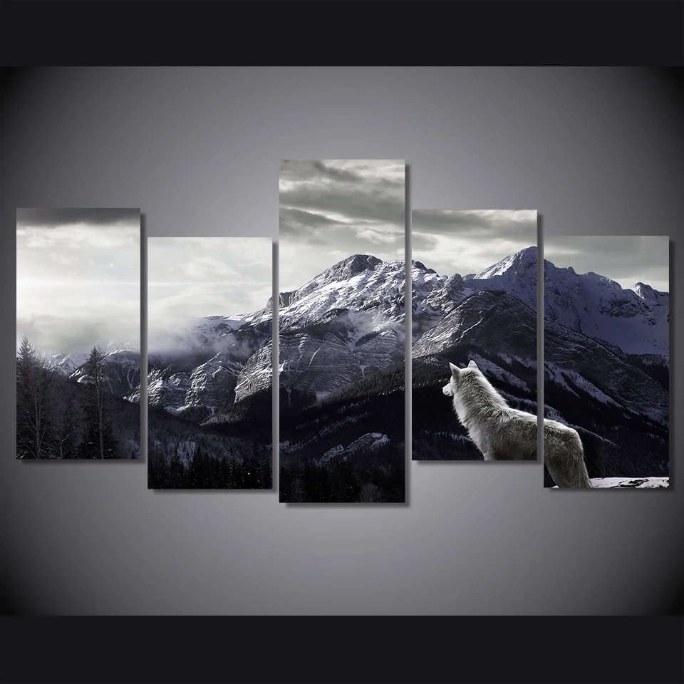 HD Prints Canvas Wall Art Living Room Home Decor Pictures 5 Pieces Snow Mountain Plateau Wolf Paintings Animal Posters Framework